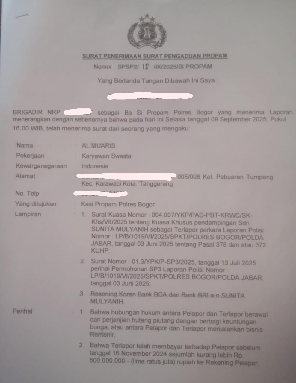 Pengaduan tersebut diterima langsung oleh Seksi Propam Polres Bogor pada Selasa, 9 September 2025 pukul 16.00 WIB, yang diajukan oleh Al Muaris, pendamping hukum dari Saudari Sunita Mulyanih.